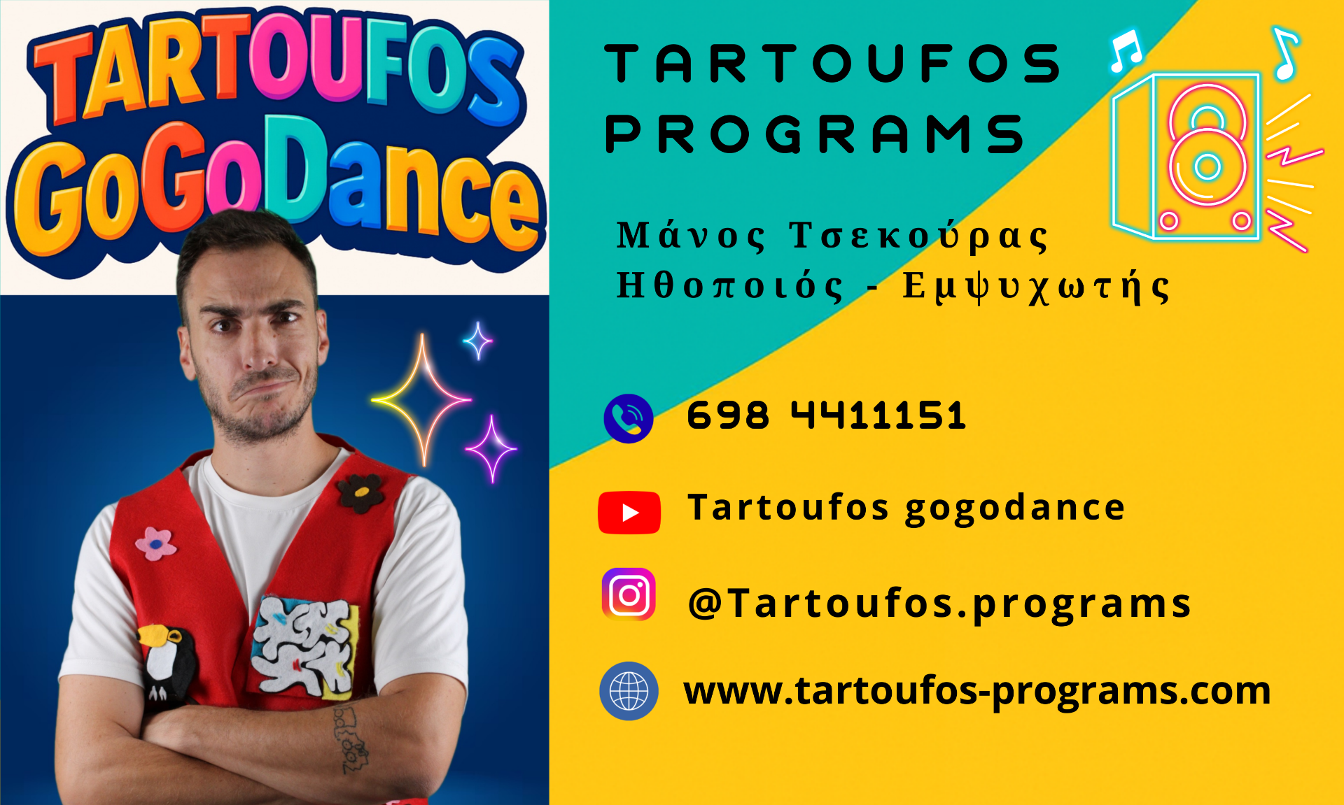 Η ομάδα «Tartoufos Programs» παρουσιάζει πρωτότυπα βιωματικά προγράμματα και θεατρικές παραστάσεις σε παιδικούς σταθμούς, νηπιαγωγεία, εκδηλώσεις και φεστιβάλ για την προσχολική και την πρώτη σχολική ηλικία.
